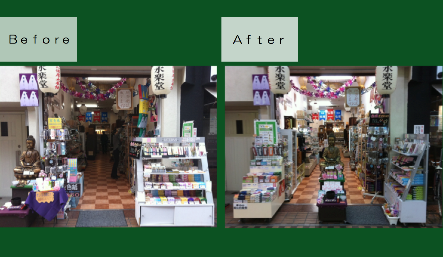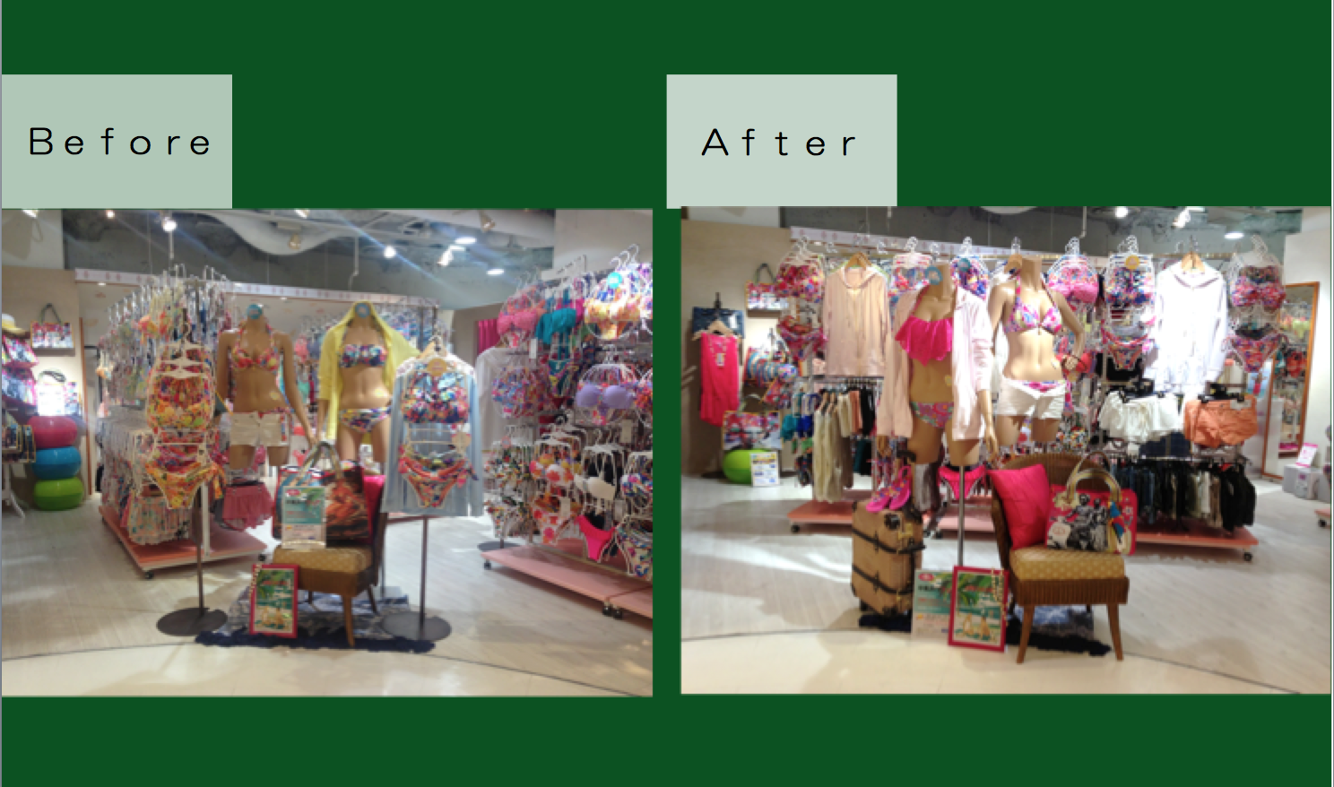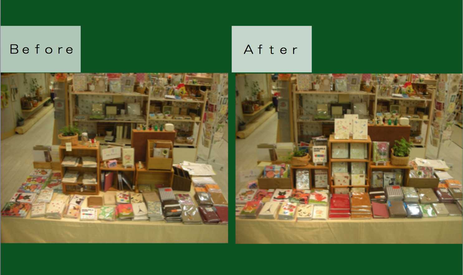 ・什器配置、商品カテゴリーの区分、商品陳列までを実際に、スタッフさまや責任者さまと一緒に、レクチャーしながら改善します。